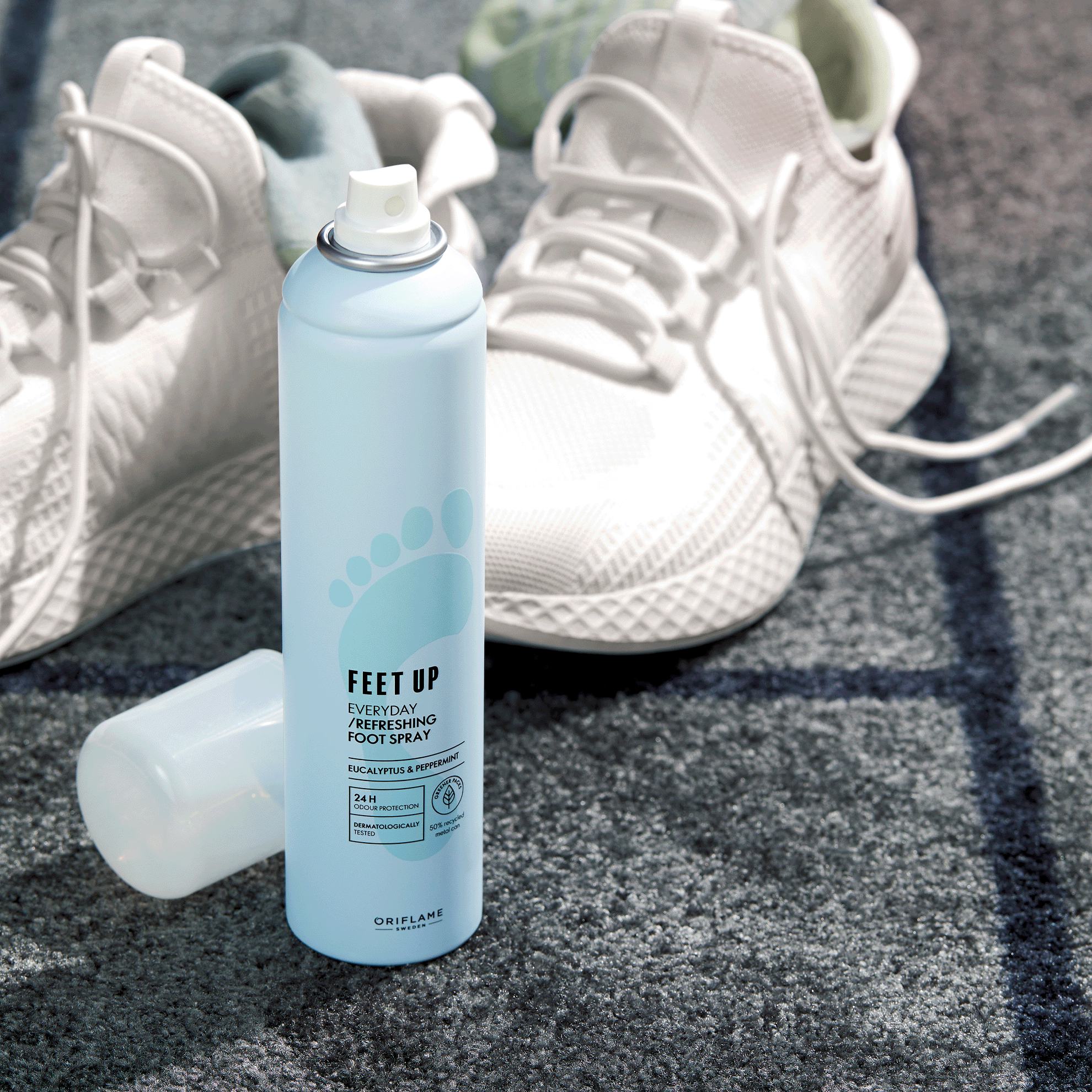 Poživite utrujena stopala s tem hladilnim sprejem. Okrepljen z naravnim oljem evkaliptusa in poprove mete. Stopala so po nanosu brez neprijetnega vonja in osvežena 24 ur. Dermatološko testirano, ne vsebuje parabenov.ALCOHOL DENAT., BUTANE, ISOBUTANE, PROPANE, GLYCERIN, MENTHOL, POLYGLYCERYL-3 CAPRYLATE, MENTHONE GLYCERIN ACETAL, MENTHA PIPERITA OIL, AQUA, PARFUM, LIMONENE, LINALOOL, HEXYL CINNAMAL, EUCALYPTUS GLOBULUS LEAF OIL