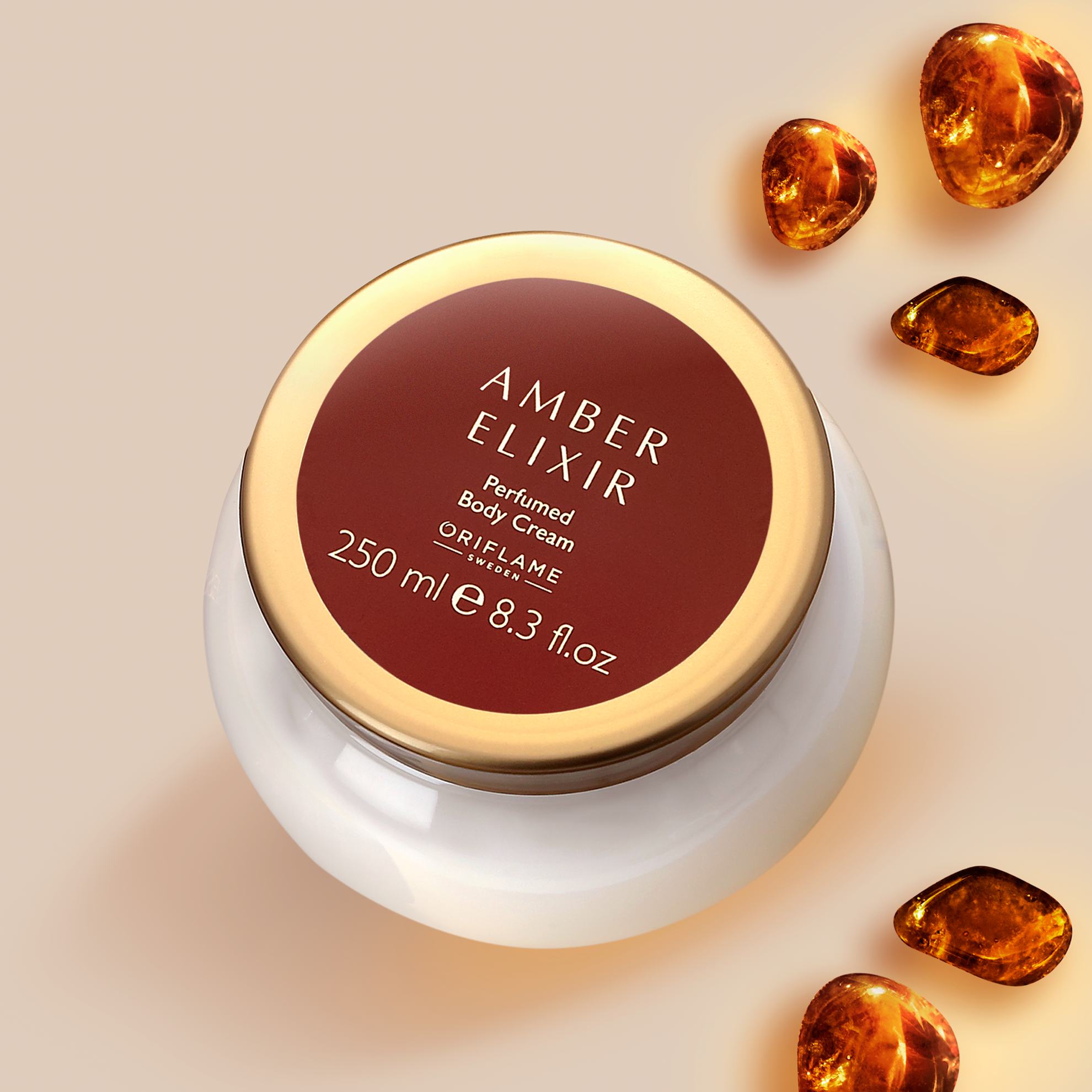 Razkošna, vlažilna krema za telo, bogato odišavljena s toplim in zapeljivim vonjem Amber Elixir, očarljivo orientalsko-lesno dišavo, ki v sebi združuje mandarine, posončnice in jantar. Čudovita samostojna izkušnja dišave ali pa dodatek k vaši Amber Elixir parfumski vodi.
