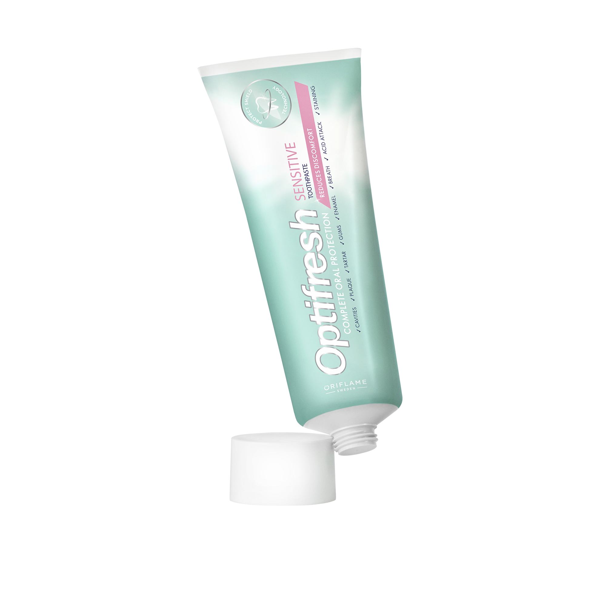 Formulirano z sredstvom za zmanjševanje občutljivosti zob. Vsebuje Protect Shield tehnologijo, ki pomaga zaščititi celotna usta. Ščiti zobno sklenino in preprečuje nastanek kariesa, zobnih oblog in zobnega kamna. Biorazgradljiva formula.SORBITOL, AQUA, HYDRATED SILICA, GLYCERIN, POTASSIUM NITRATE, PEG-8, SODIUM LAURYL SULFATE, AROMA, CELLULOSE GUM, SODIUM FLUORIDE, SODIUM SACCHARIN, DISODIUM PHOSPHATE, LIMONENE, SODIUM CARBONATE