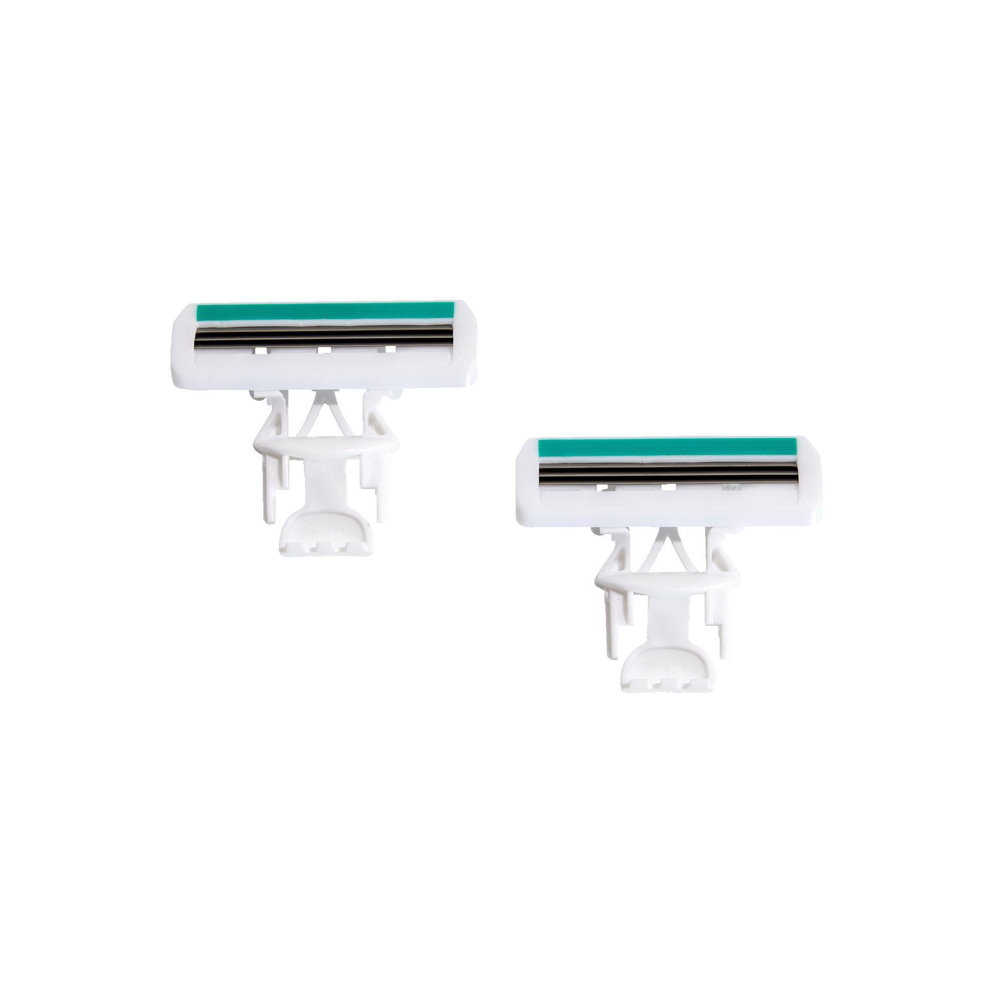 Dve vrtljivi glavi s trojnim rezilom za uporabo z britvico za večkratno uporabo. Z vlažilnim trakom z aloe vero in vitaminom E za enostavno in gladko britje. Priložen je zaščitni pokrovček za posamezno rezilo. Varni za uporabo in enostavni za zamenjavo.