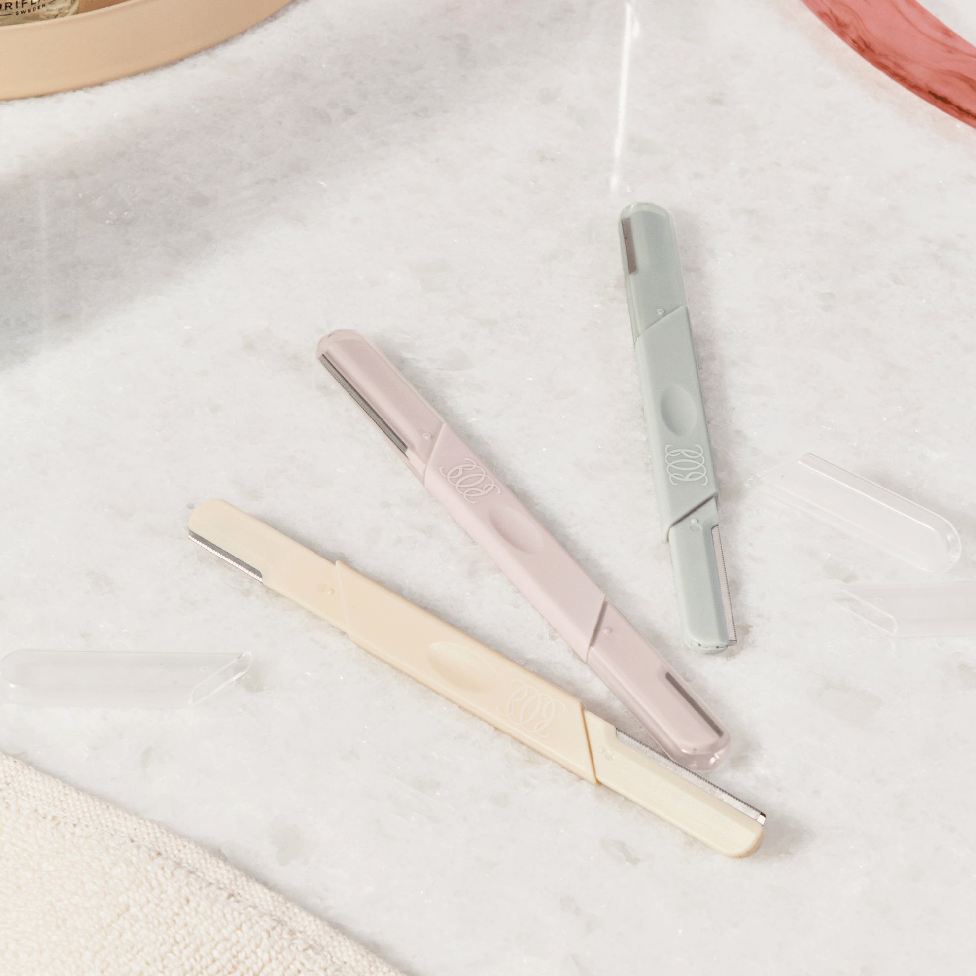 Za enostaven dermaplaning! Odstranite obrazne dlačice in natančno oblikujte obrvi. Ta komplet treh britvic za obrvi in obraz v ljubkih barvah in z visoko kakovostnimi japonskimi rezili omogoča gladko, mehko in bolj zdravo kožo, ki je pripravljena na nanos negovalnih izdelkov in make-upa. Britvice imajo dve rezili, eno manjše in eno večje za delovanje na različne predele obraza.